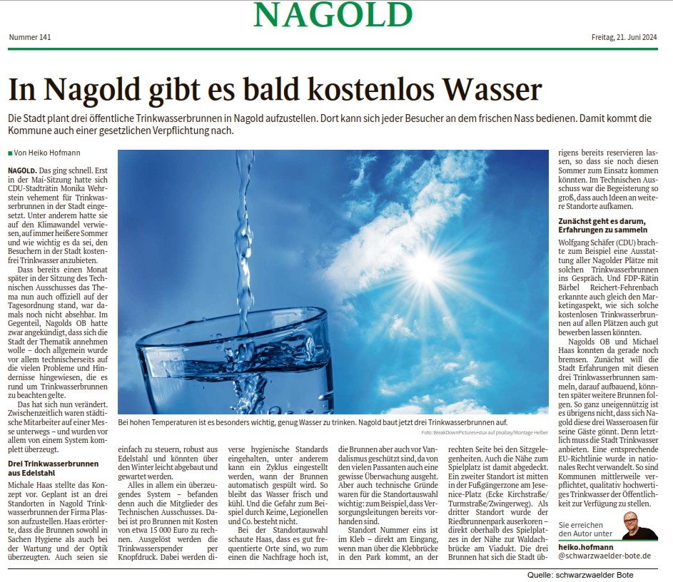 2024 Nagold „In Nagold gibt es bald kostenlos Wasser“ [featured_image] 2024 Nagold „In Nagold gibt es bald kostenlos Wasser“ Version Download 15 Dateigröße 283.42 KB Datei-Anzahl 1 Erstellungsdatum 11. März 2026 Zuletzt aktualisiert 11. März 2026 2024 Nagold "In Nagold gibt es bald kostenlos Wasser" 2024 Rutesheim Trinkbrunnen auf dem Marktplatz eingeweiht 2024 Künzelsau „Neuer Trinkwasserbrunnen in Künzelsau“
